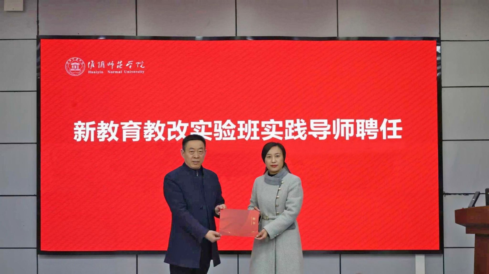 图为史晖为卢梅英颁发实践导师聘书