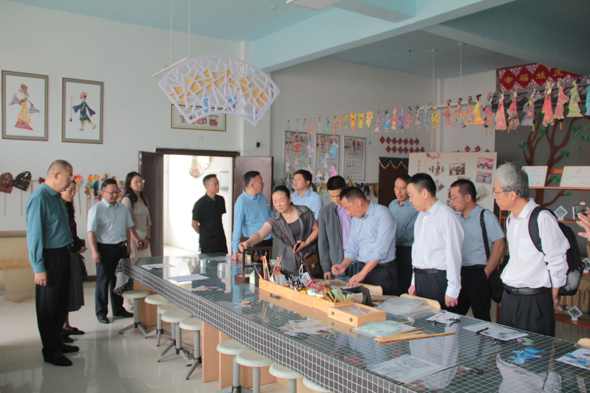 图为淮师一行参观涟水县幸福里实验小学皮影工作坊